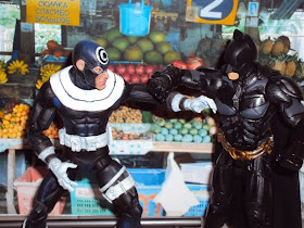 Another DC versus Marvel crossover . Bat-Man, a man who knows over a hundred different fighting styles versus Bullseye, a man that can murder someone by throwing a pencil at them . Plus this time I have inserted a background I found off of the web . A fruit stand . I think Bat-Man would win if they met, however Bullseye is not a foe to be taken likely himself, as he has defeated characters such as Elektra in the comics. The ground you see displayed is a cropped image of a Tech Deck playset . Enjoy the pics.